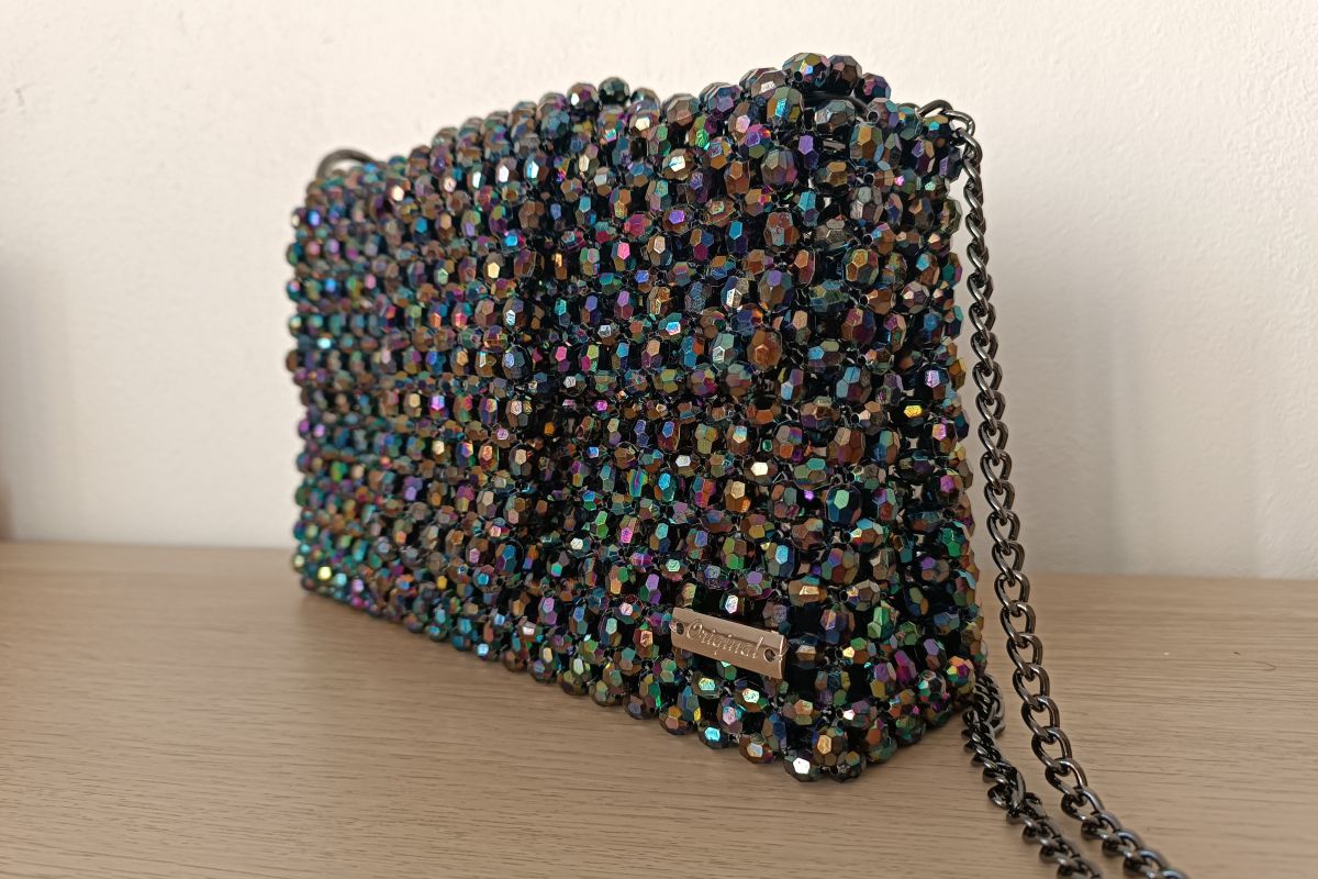Poznaj dodatek, który łączy w sobie odważną energię barw z klasyczną elegancją. Ta ręcznie wyplatana torebka to hipnotyzujące połączenie głębokiej czerni i tęczowego blasku. Dzięki akrylowym koralikom (8 mm), całość efektownie odbija światło, tworząc unikalny, niemal biżuteryjny efekt.